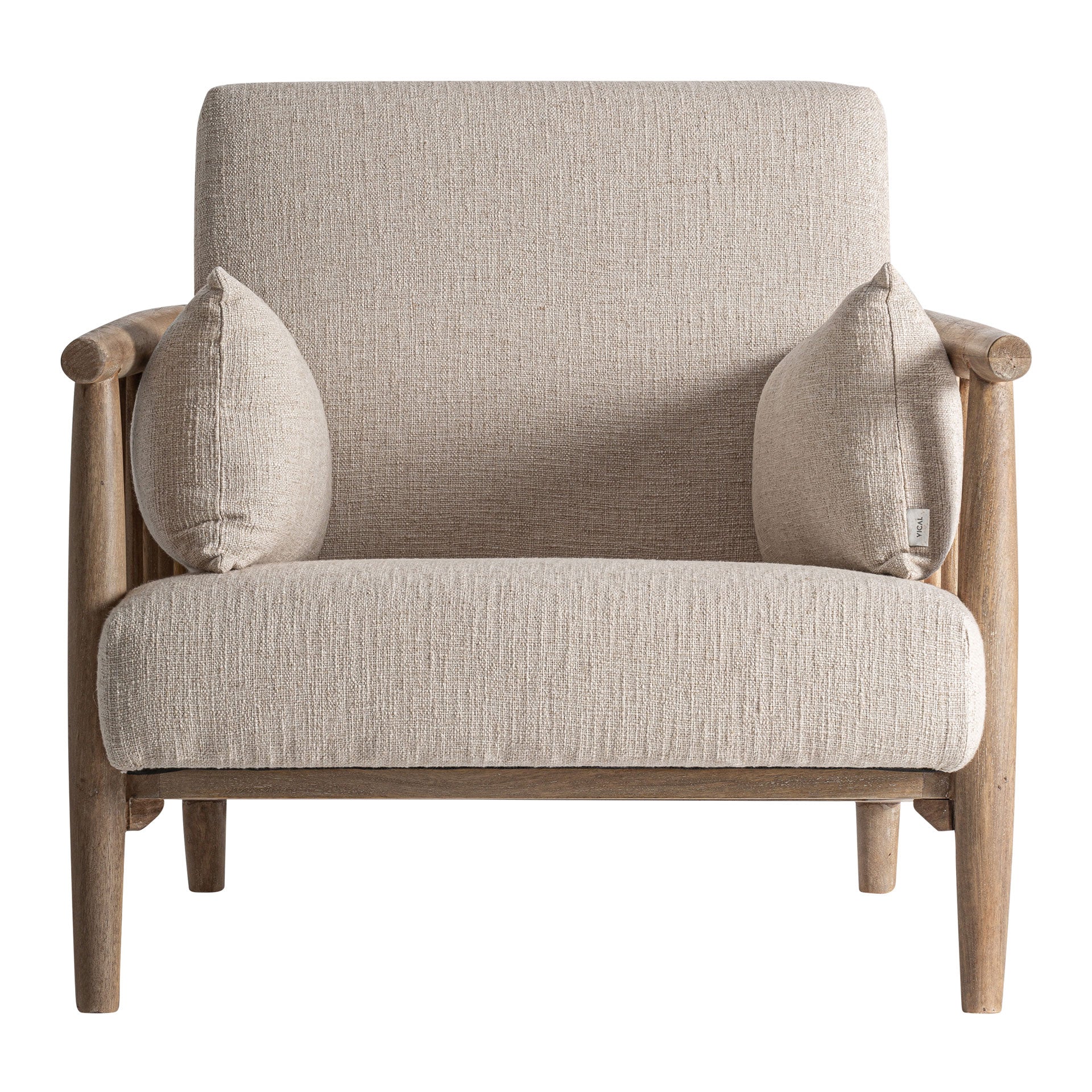 Dieser Sessel von VICAL besticht durch seine warme, einladende Ausstrahlung. Das Birkenholzgestell harmoniert mit dem beigefarbenen Baumwollbezug und schafft ein gemütliches, stilvolles Möbelstück, ideal für Leseecken oder Entspannungsbereiche.