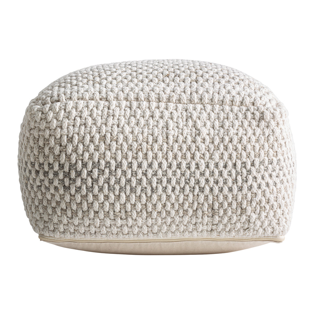 Boho Pouf Hocker aus weicher Wolle in Off White mit grauem Schaumstoffkern. Minimalistisches, gemütliches Design – ideal für Wohnzimmer, Schlafzimmer oder Lounge. Perfekt als Sitzgelegenheit, Beistelltisch oder stilvolles Wohnaccessoire im Boho Stil.