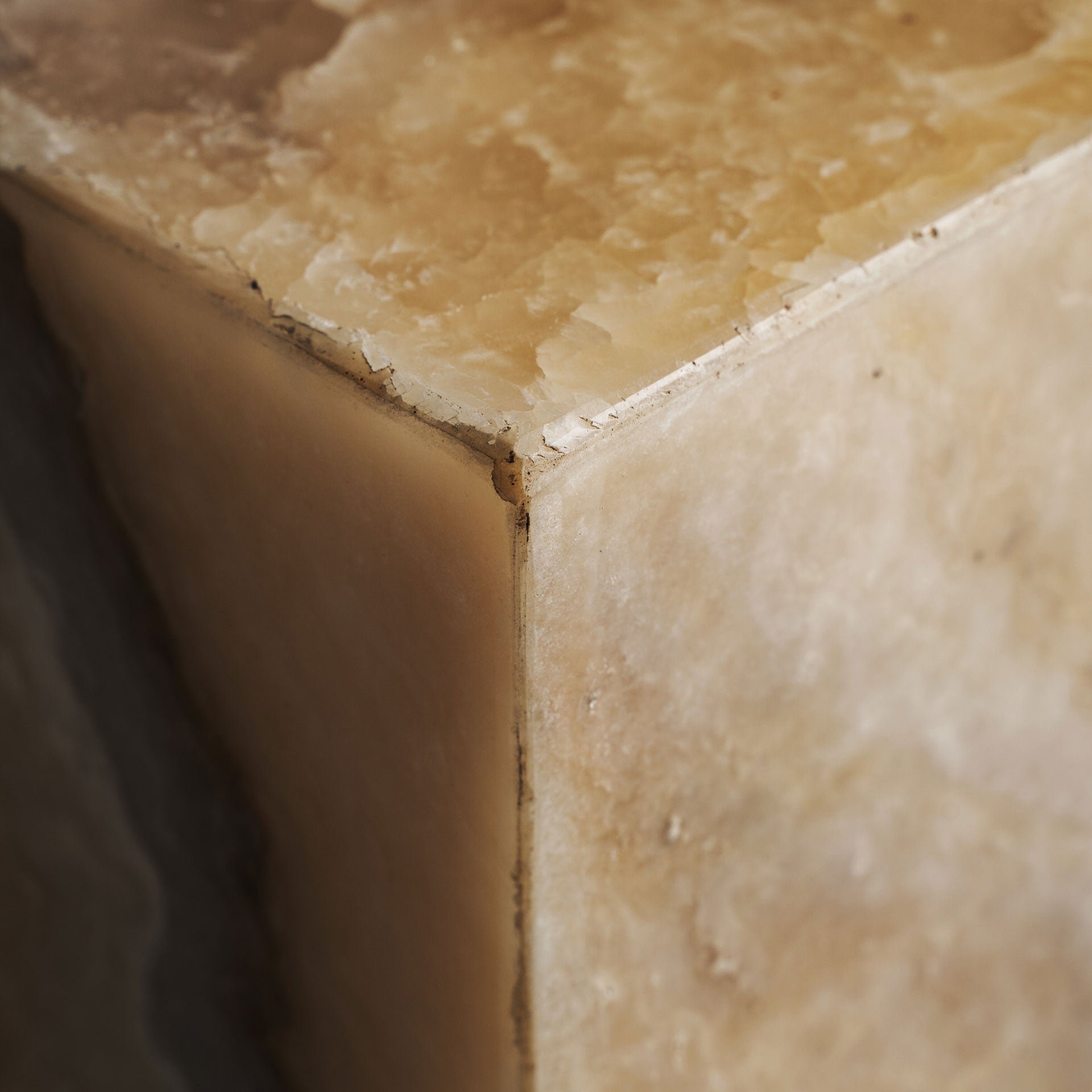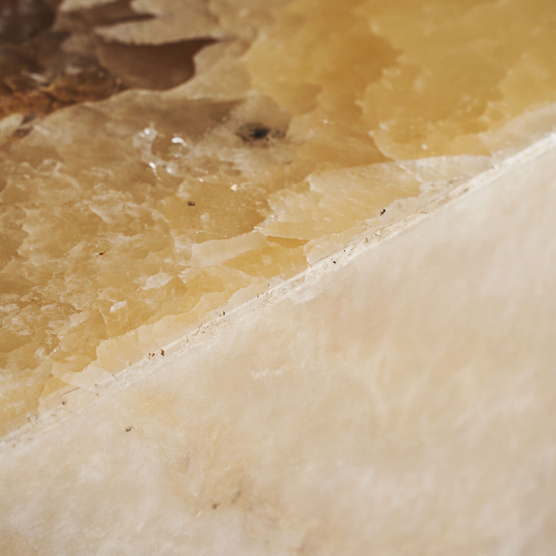 Dieser Beistelltisch aus elfenbeinfarbenem Onyx besticht durch seine klare Geometrie und die sanfte Maserung des Steins. Die transluzente Oberfläche lässt Licht auf subtile Weise durchscheinen und verleiht jedem Raum eine elegante, warme Atmosphäre. Jedes Exemplar ist ein handgefertigtes Unikat und verbindet hochwertige Verarbeitung mit ausdrucksstarker Contemporary-Ästhetik.