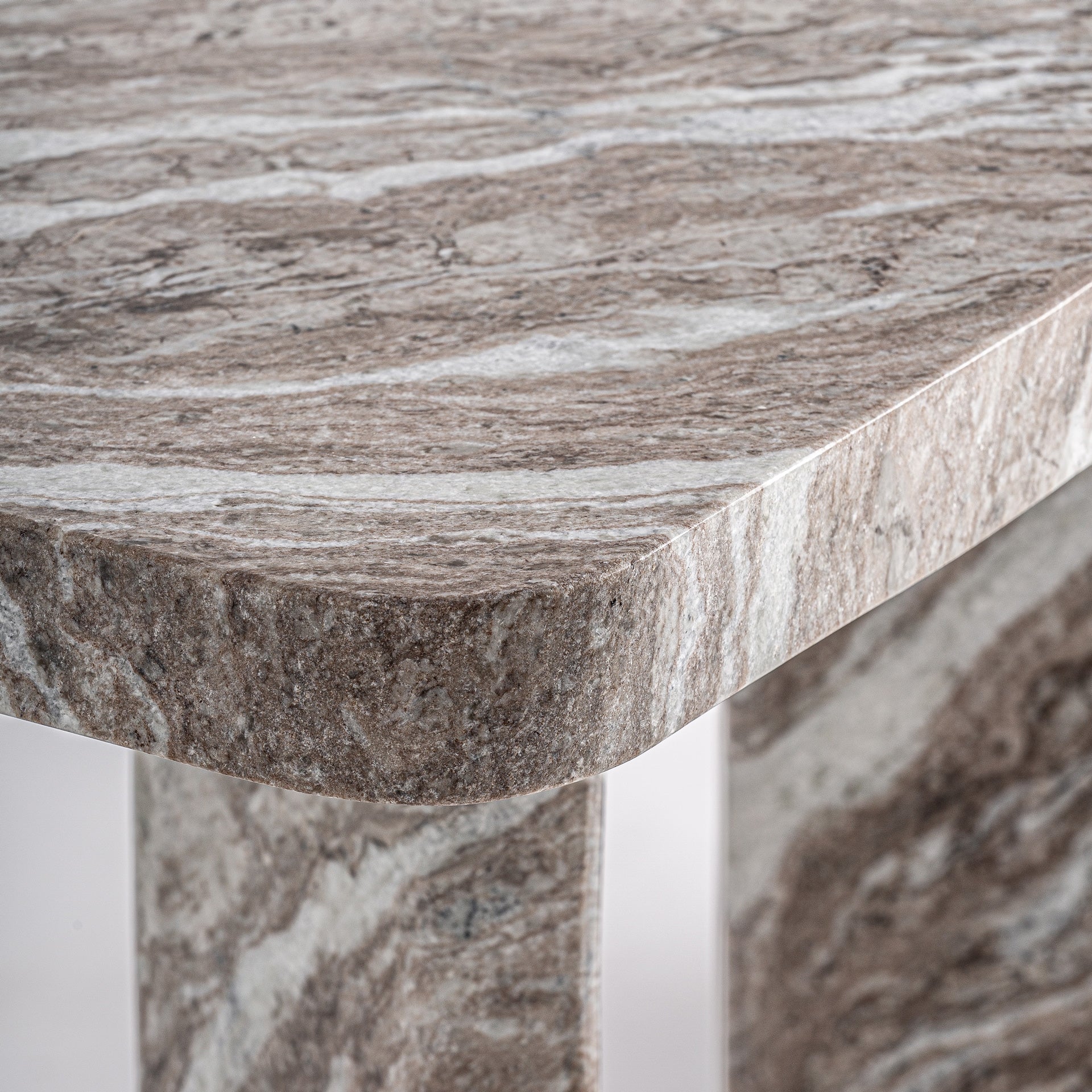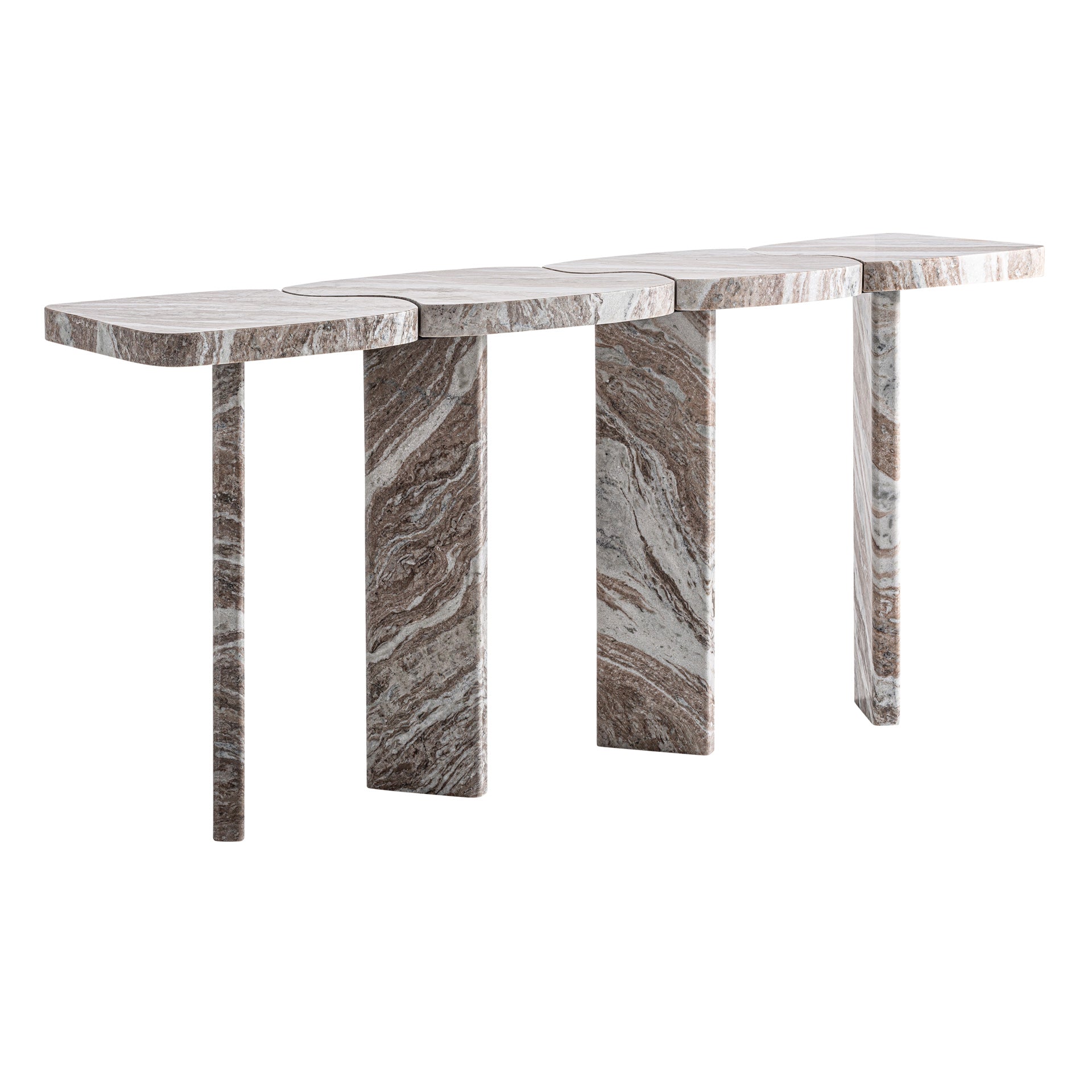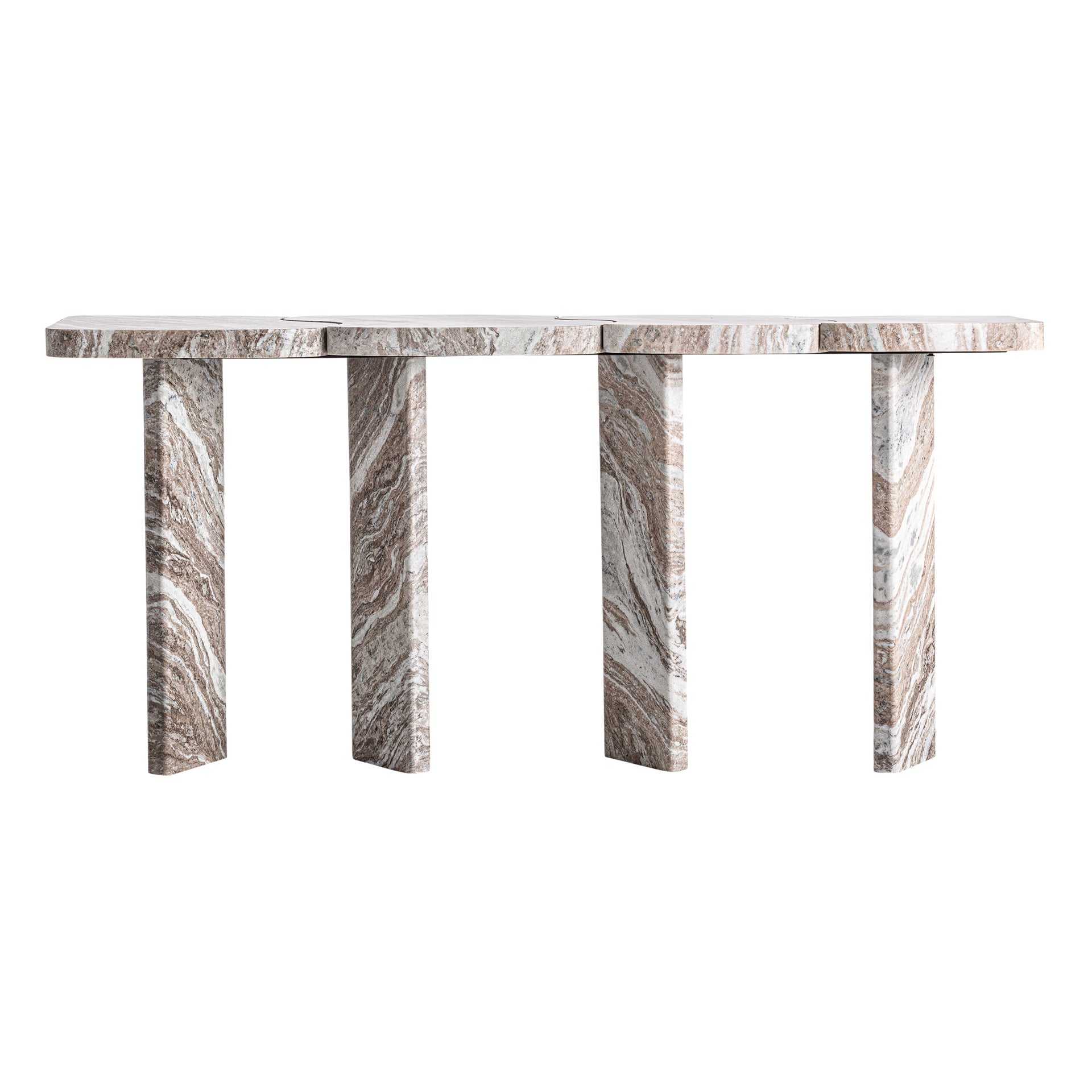 Dieser Konsolentisch ist aus Massivmarmor gefertigt und besticht durch seine natürliche, marmorierte Oberfläche in neutralen, erdigen Tönen mit cremefarbenen Akzenten. Die klaren, modernen Linien verbinden zeitlose Eleganz mit hochwertiger Handwerkskunst und machen den Tisch zu einem exklusiven Blickfang in jedem Flur oder Wohnzimmer.