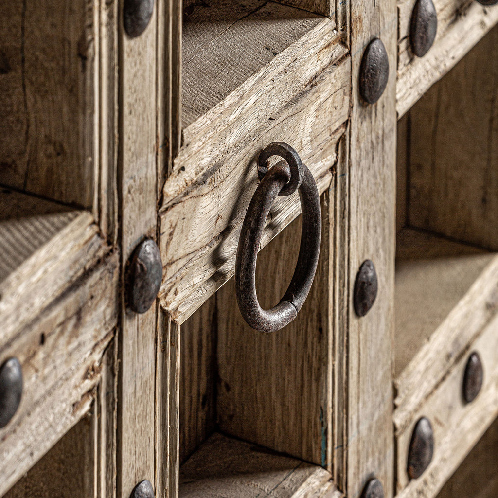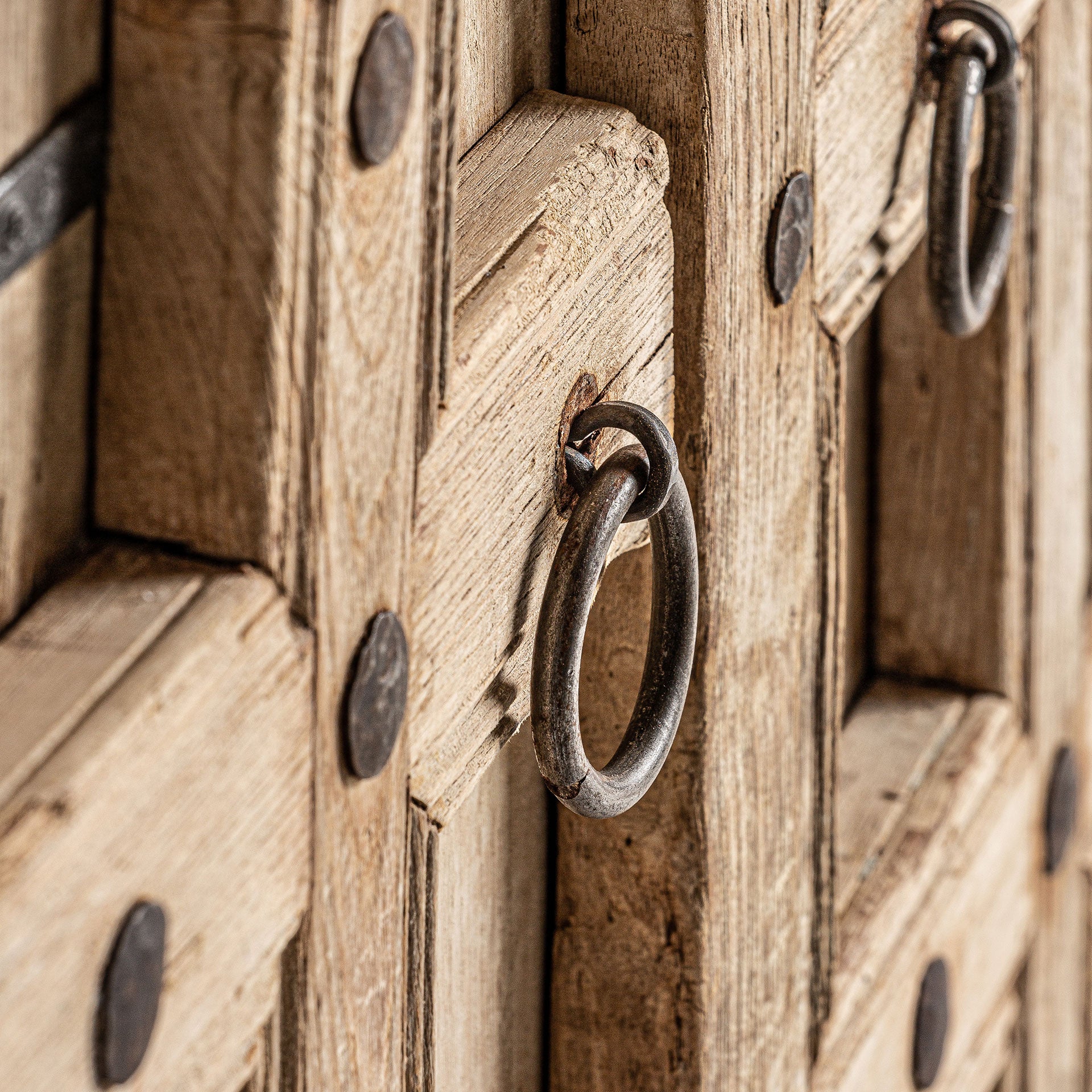Unser handgefertigtes Sideboard im Ethno Stil aus Mangoholz ist ein wahres Kunstwerk. Mit seinen detailreichen Schnitzereien und dem distressed Finish strahlt es rustikalen Charme aus. Die viertürige Konstruktion bietet großzügigen Stauraum und verleiht Ihrem Raum einen Hauch von traditionellem Flair.