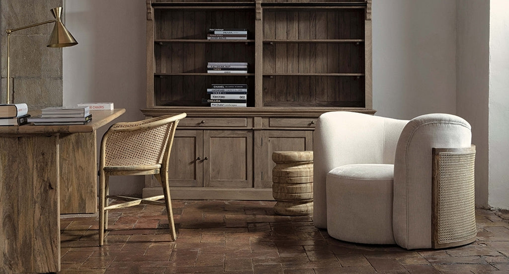 Handgefertigter Sessel aus Holz und Rattan in Off White