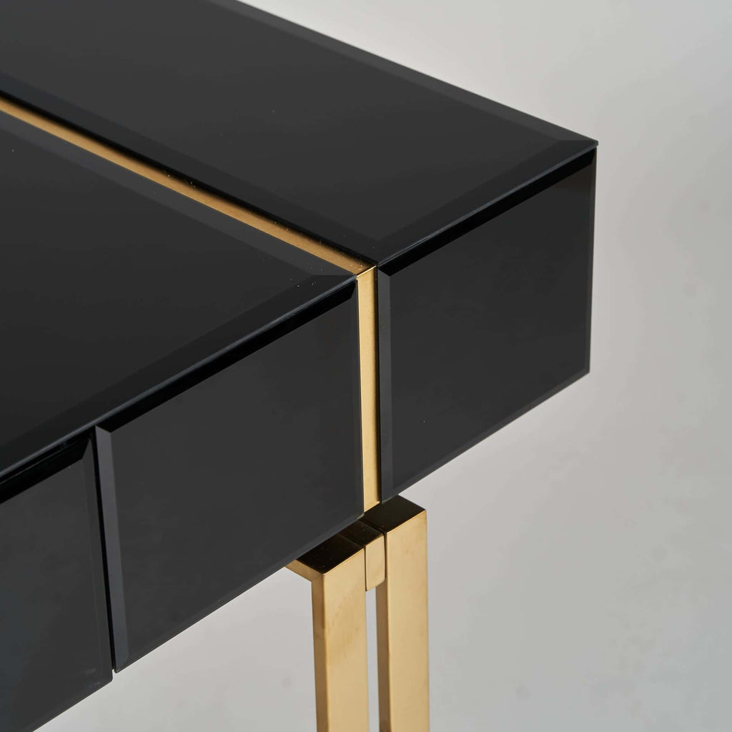 Schwarze Konsole aus Kristallglas mit einer Schublade und goldenen Elementen