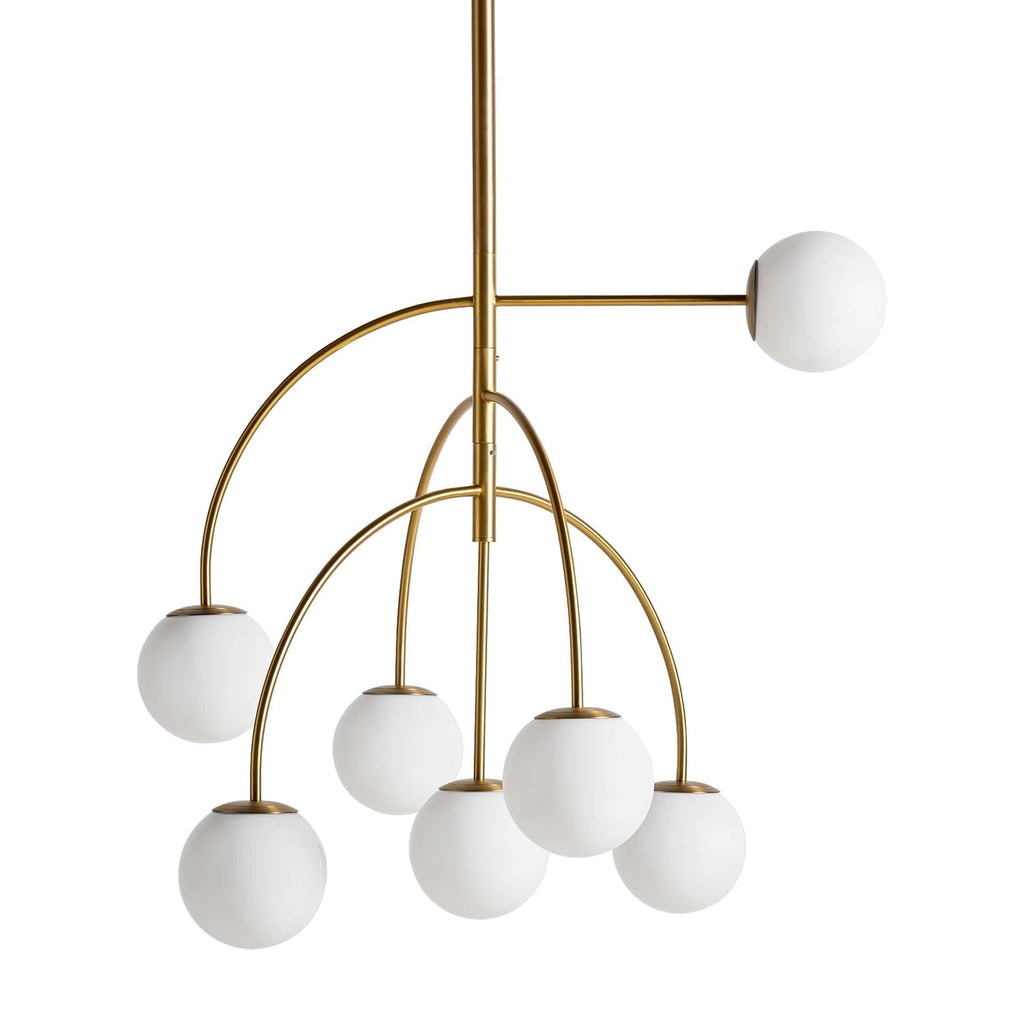 Deckenleuchte aus goldenem Messing kombiniert mit sieben weissen Kristallglaskugeln