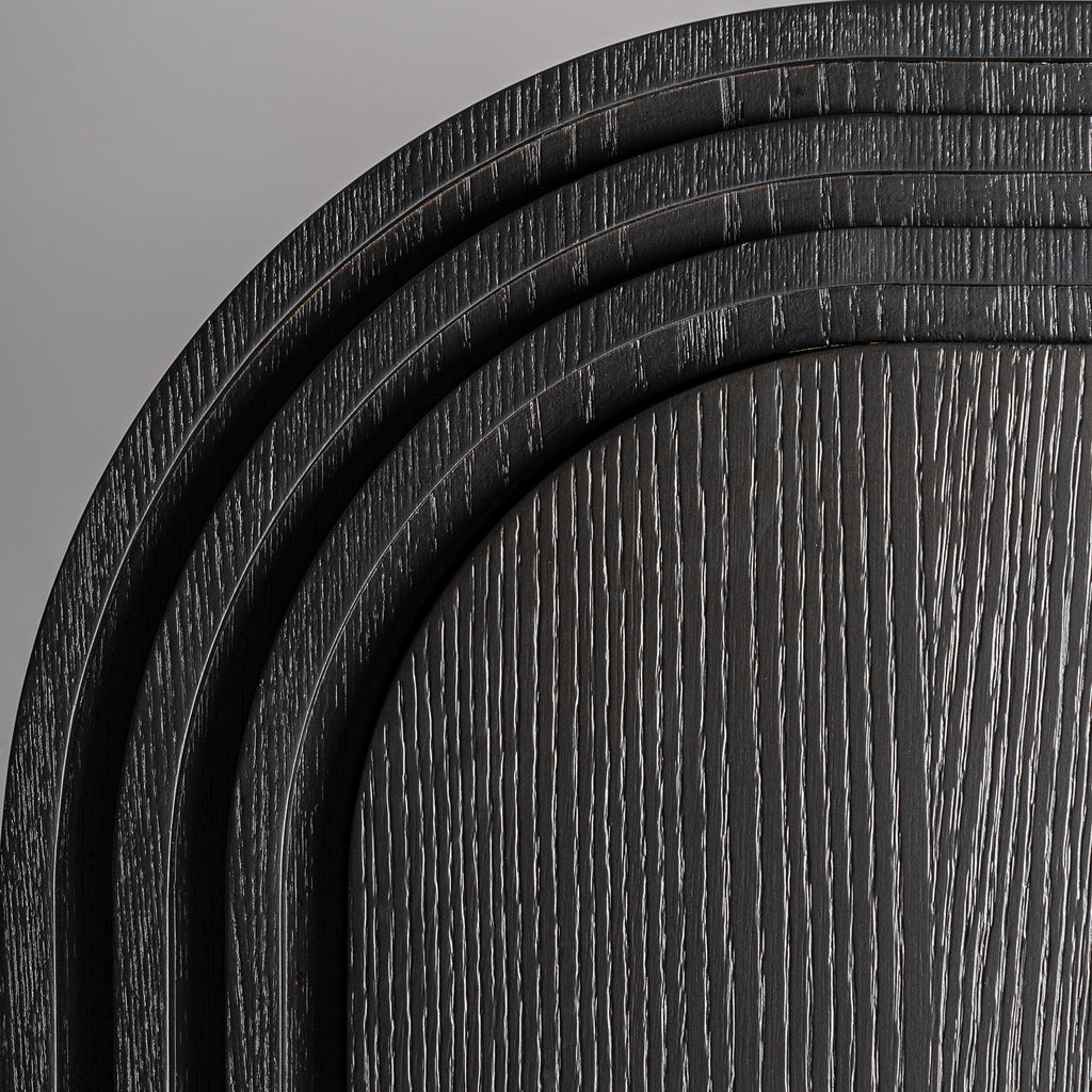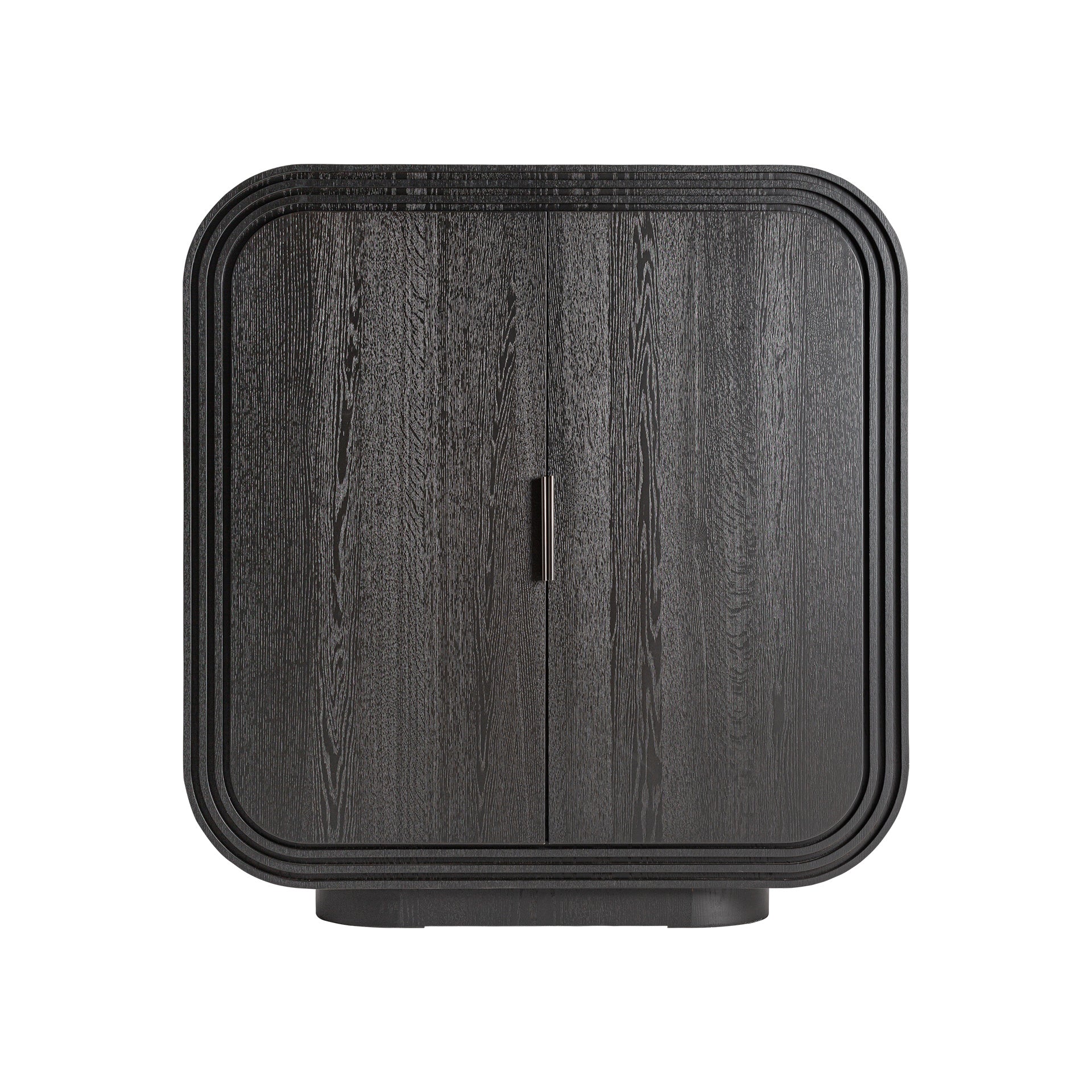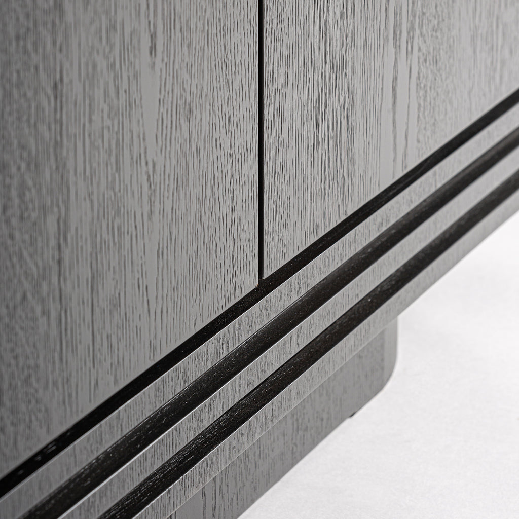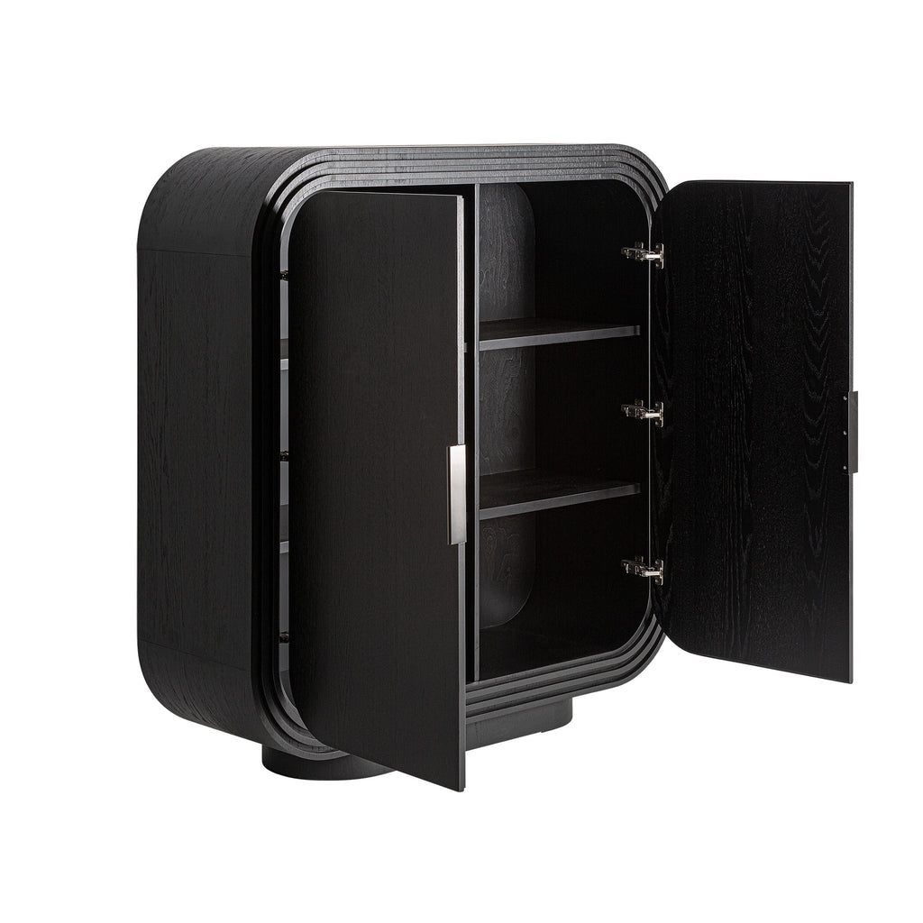 Eleganter Schrank aus schwarzer Eiche mit sanft abgerundeten, vom Art Deco inspirierten Formen. Die Kombination aus moderner Klarheit und charaktervoller Holzstruktur verleiht dem Möbelstück eine starke, zeitlose Präsenz. Ideal für Wohn- und Arbeitsbereiche, die Wert auf hochwertige Materialien und dezente Eleganz legen.