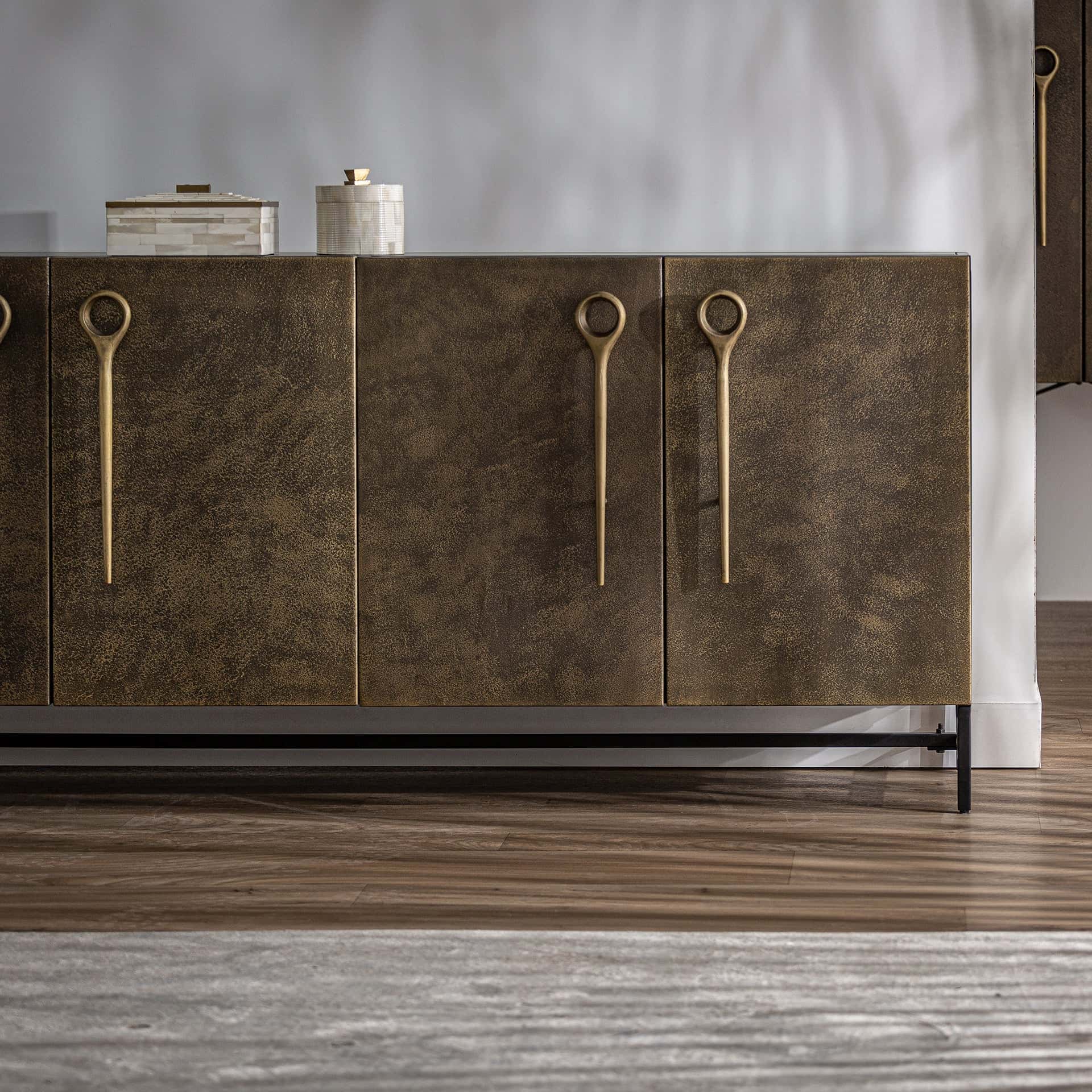 Unser viertüriges Sideboard im Art Deco Stil präsentiert sich mit einem eleganten Goldfinish, das ihm einen Hauch von Vintage-Charme verleiht. Gefertigt aus hochwertigem Eisen, strahlt dieses Möbelstück zeitlose Eleganz aus und wird zum Blickfang in jedem Raum. Ideal für Liebhaber des Art Deco Designs, die ein stilvolles und funktionales Möbelstück suchen.