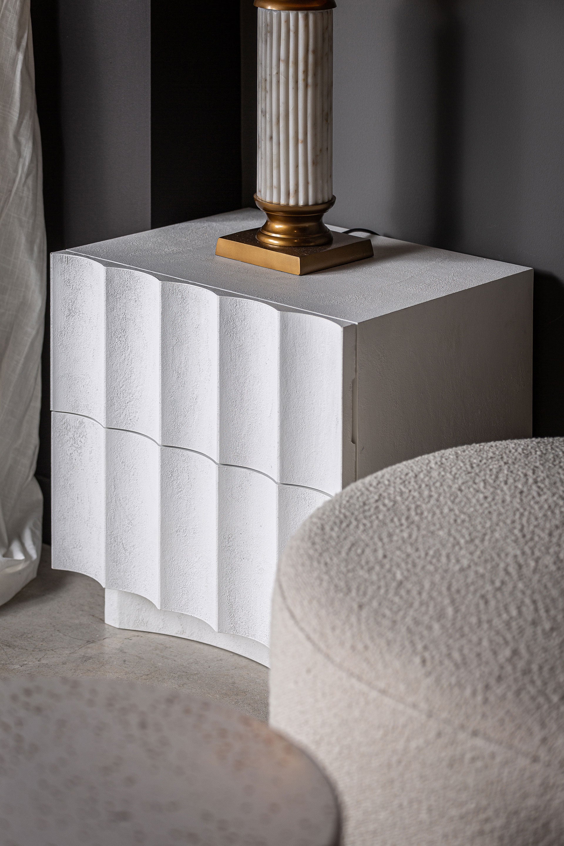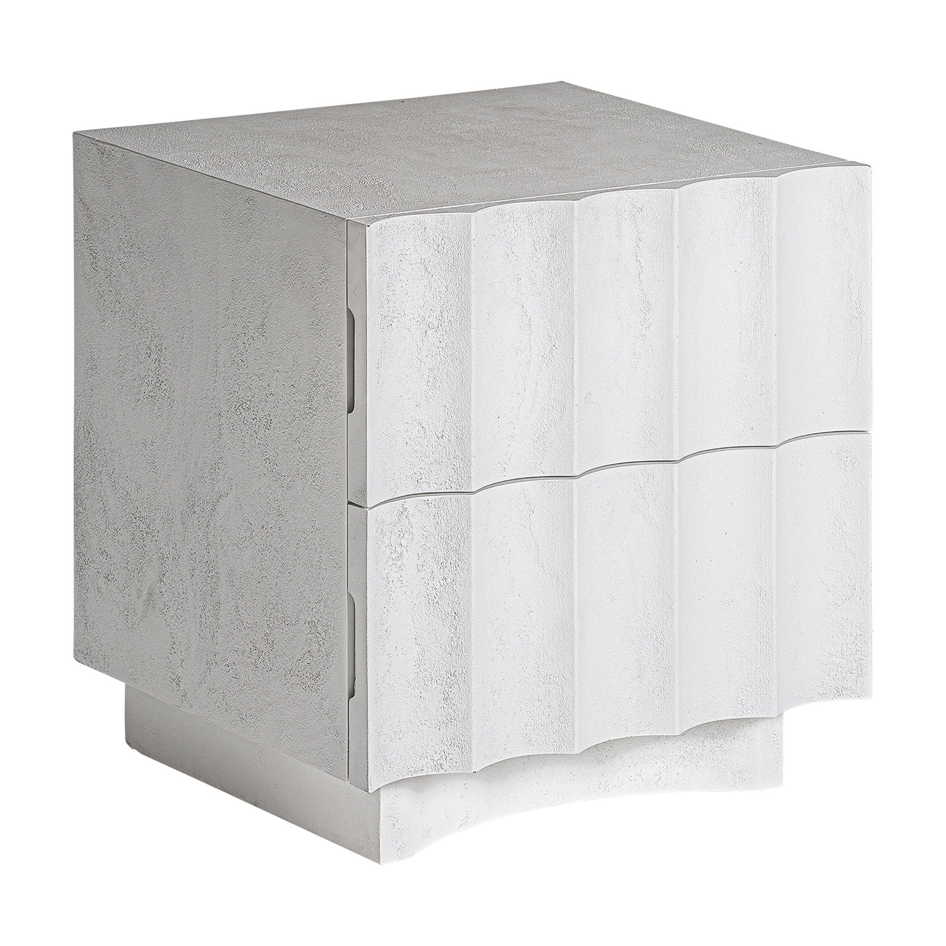 Eleganter Nachttisch im Contemporary Stil aus Harz, Kies und MDF in strahlendem Weiß. Das klare, puristische Design fügt sich harmonisch in moderne Schlafzimmer ein und vereint Funktionalität mit zeitloser Eleganz. Handwerklich präzise gefertigt, setzt der Nachttisch stilvolle Akzente und bietet praktische Ablagefläche für jeden Raum.