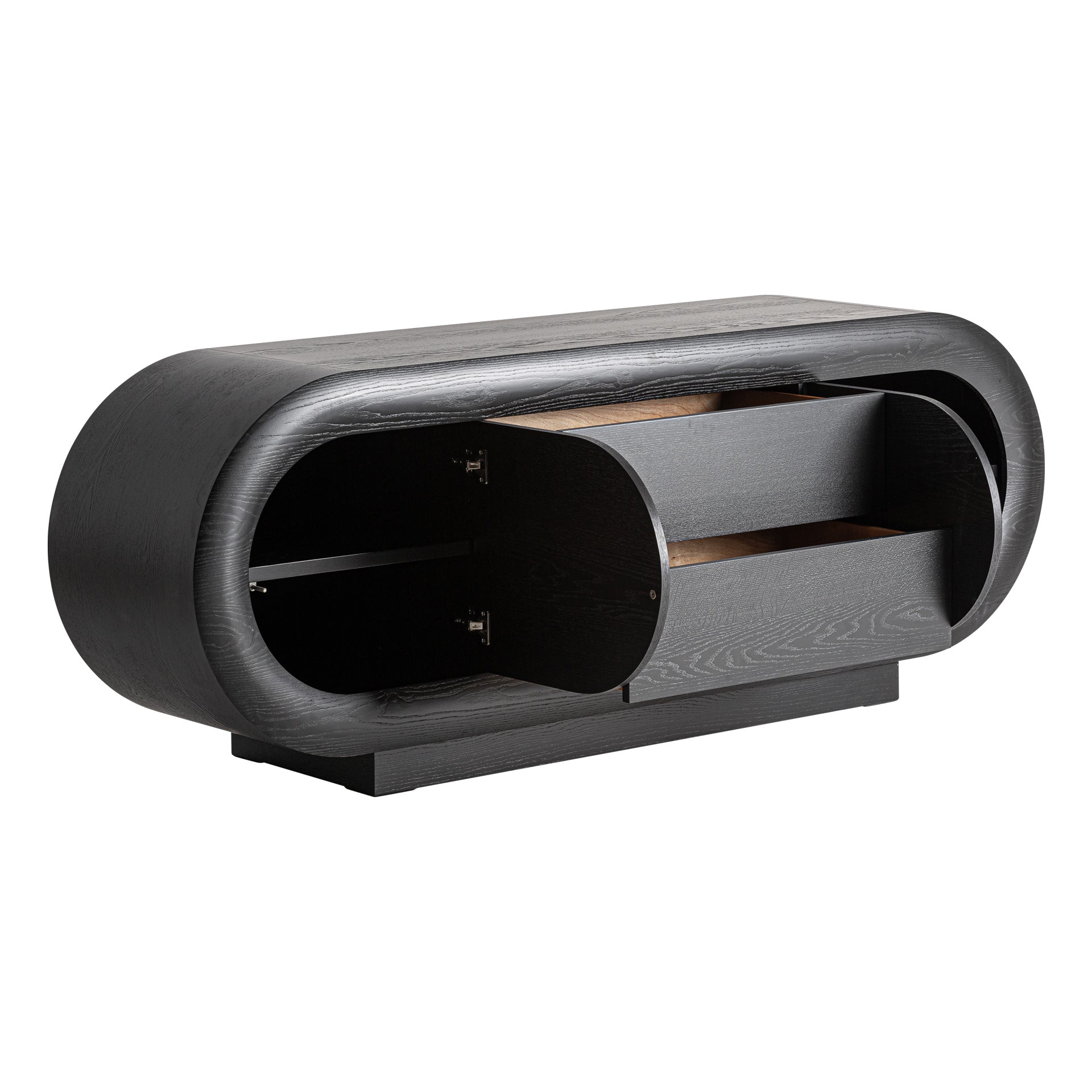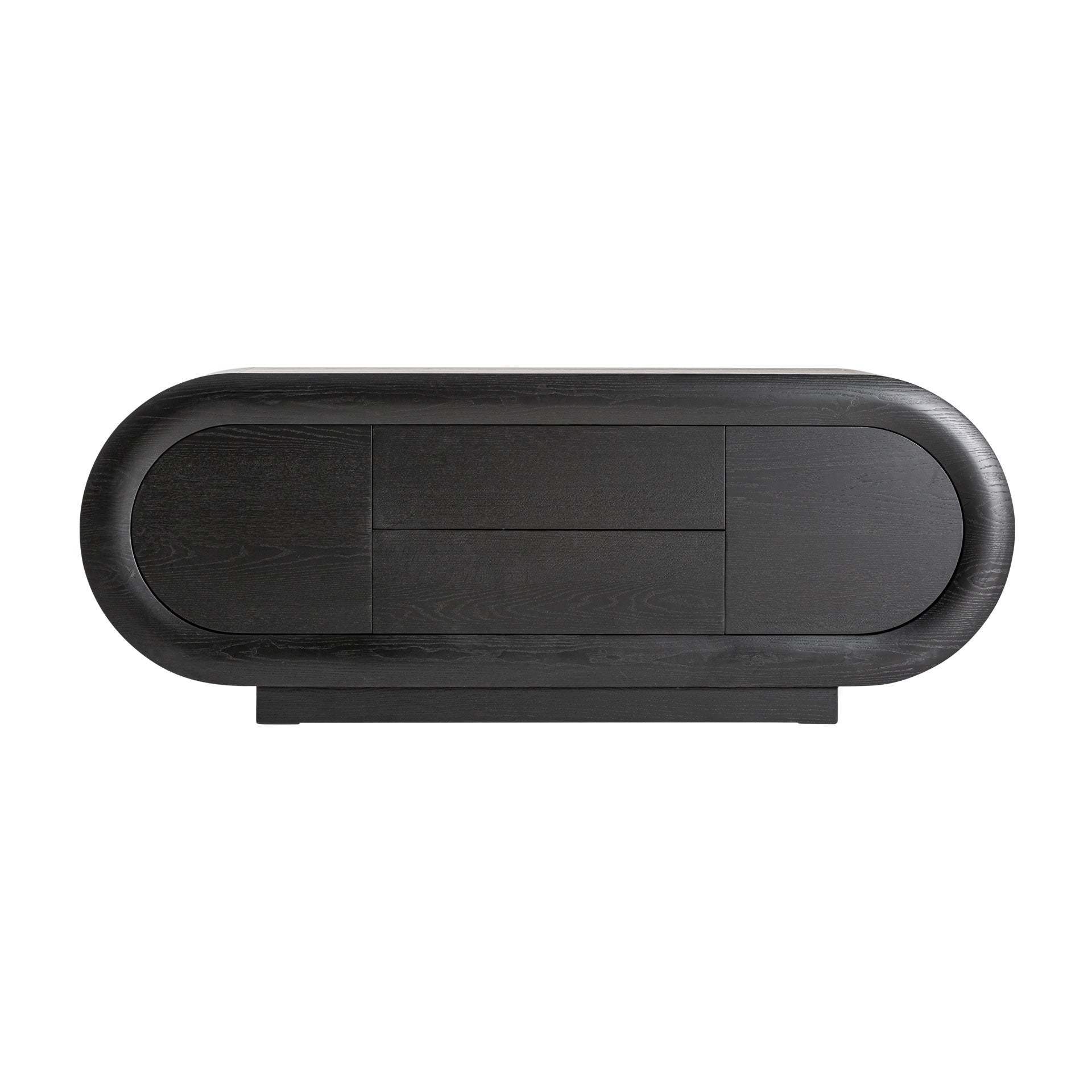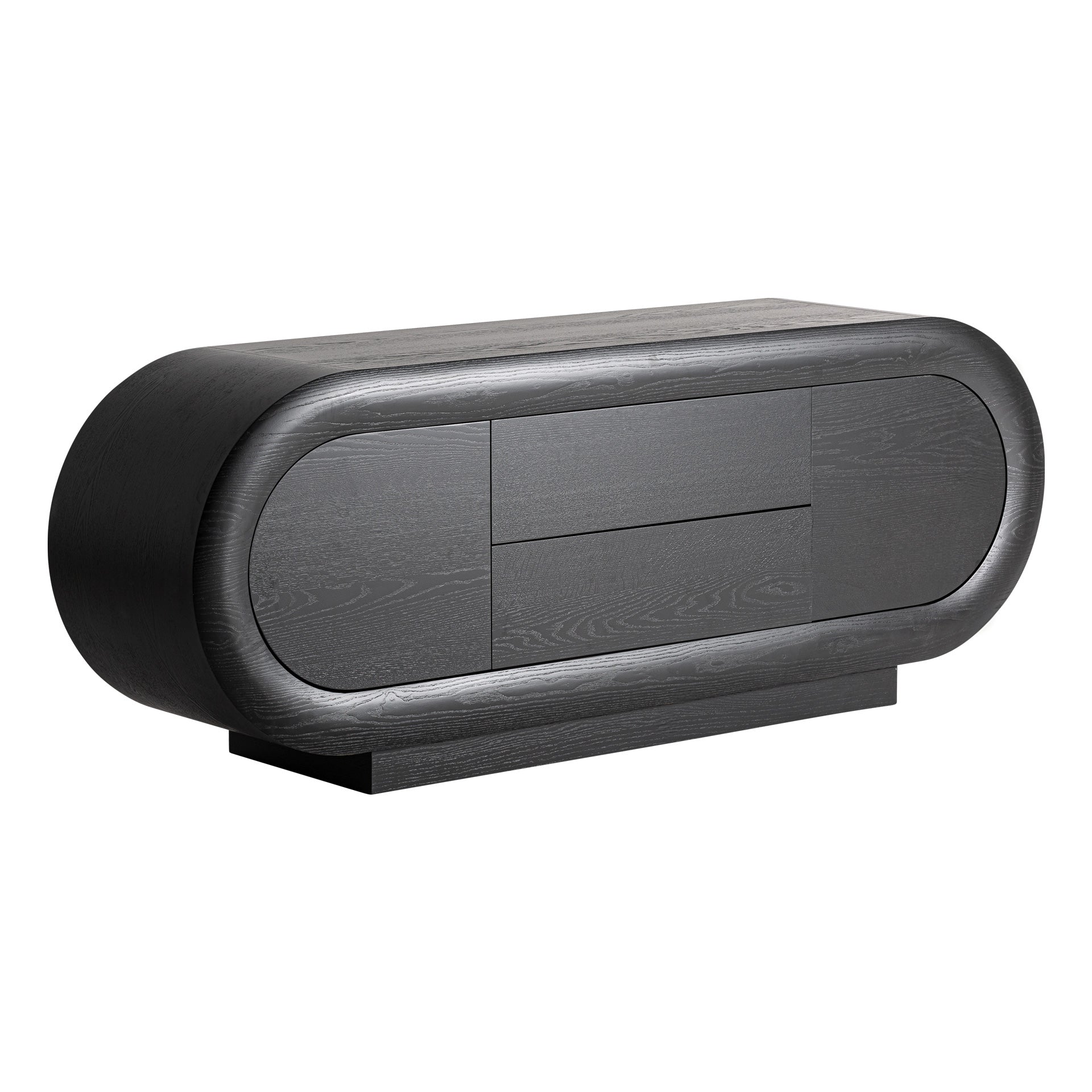 Dieses Sideboard verbindet Art Deco Inspiration mit einer modernen Formensprache und setzt durch die Kombination aus schwarzer Eiche einen markanten, zeitlosen Akzent. Die sanft abgerundeten Konturen und die grafisch wirkende Front verleihen dem Möbelstück eine elegante Präsenz, die sich ideal für stilvolle, zeitgemäße Einrichtungen eignet.