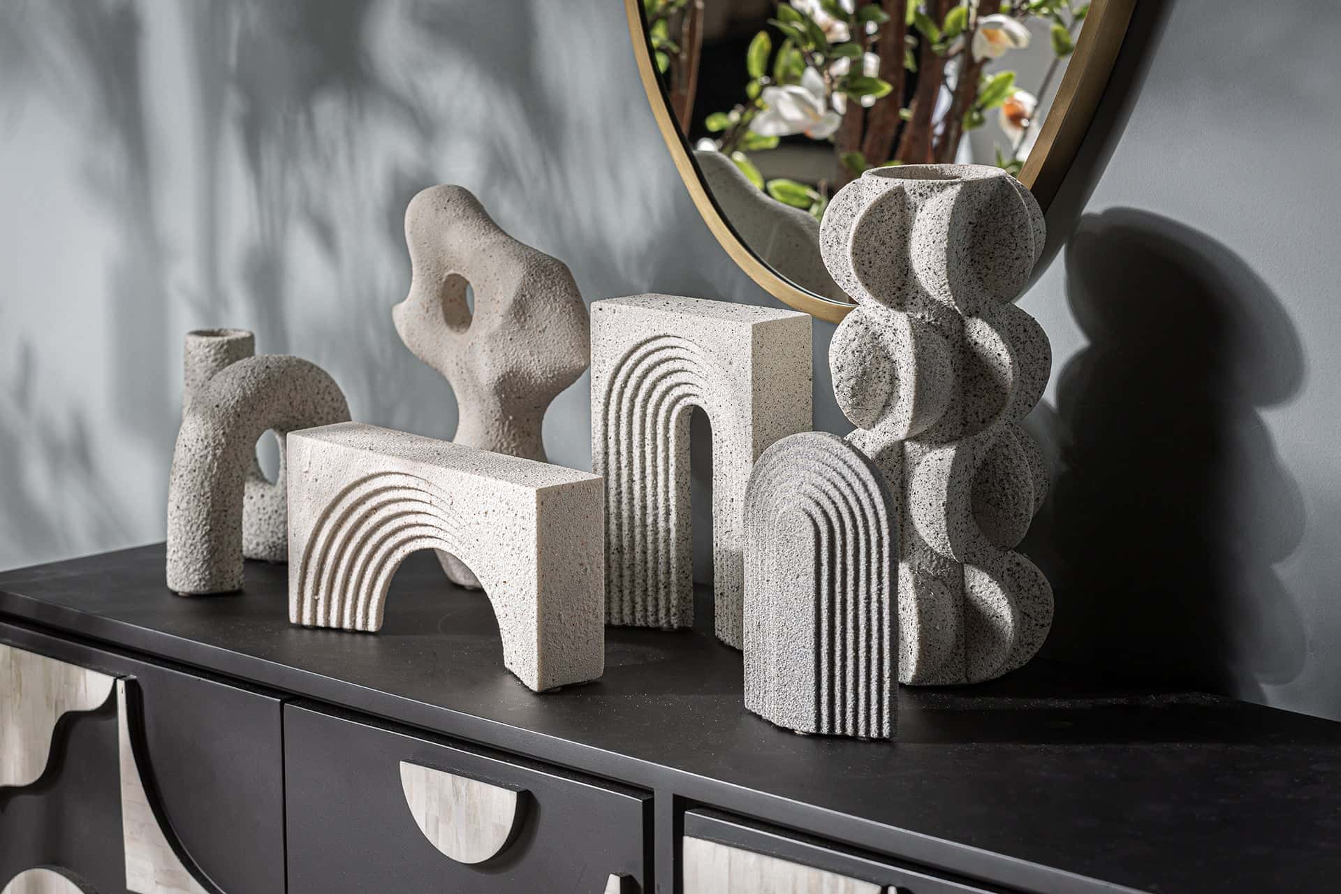 Sandfarbene Art-Deco Harz Figur mit Torbogen-Design